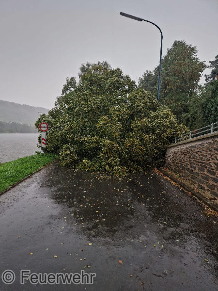 Bedingt durch eine Unwetterfront fiel auf der K65, Kövenig Richtung Reil, ein Baum auf die Straße und versperrte diese. Durch die Feuerwehr wurde der Baum mittels Kettensägen klein geschnitten und die Straße wieder frei geräumt.