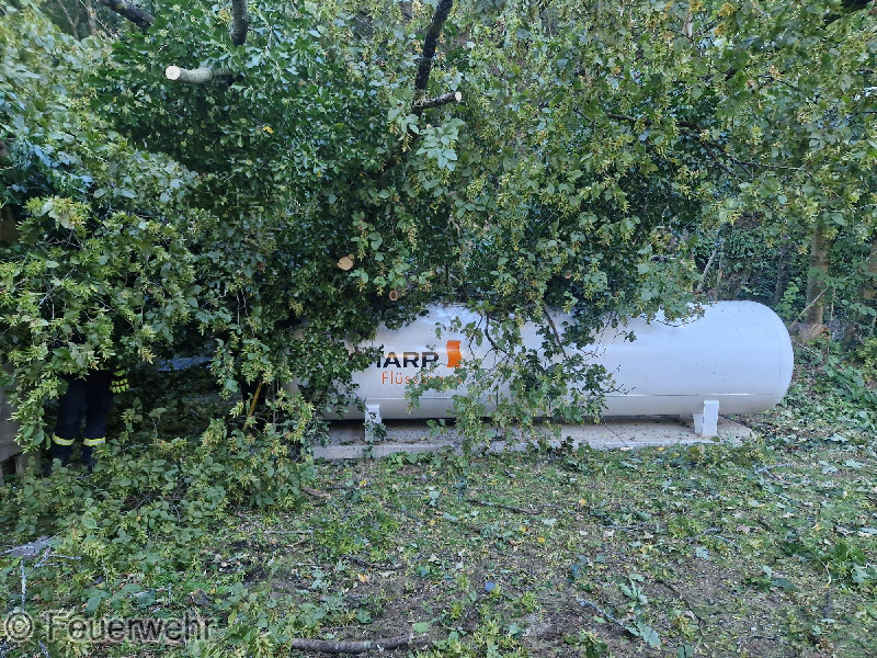 In der Ortslage Trarbach fiel ein Baum auf einen Gastank. Da Teile des Baumes auf dem Absperrhahn des Tanks lagen mussten diese mittels Kettensäge zerlegt werden. Anschließend wurden der Tank und der Absperrhahn auf Beschädigungen kontrolliert. Hier konnten keine Beschädigungen festgestellt werden.