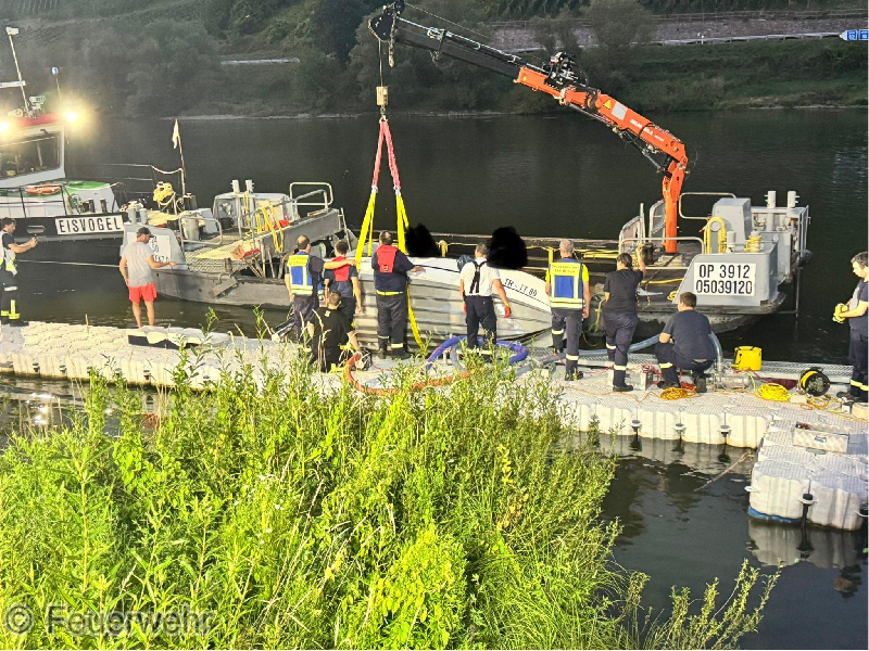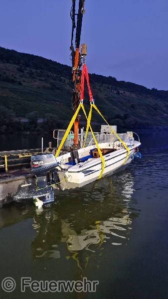 Am Bootsanleger in Reil wurde ein Boot gemeldet das unterzugehen drohte. Beim Eintreffen der ersten Kräfte war das Boot bereits fast komplett untergegangen. Durch den Besitzer und die Feuerwehr wurde dies durch Leinen festgemacht um ein weiteres untergehen und wegtreiben zu verhindern. In Absprache mit dem Wasser -und Schifffahrtsamt und der Wasserschutzpolizei wurde ein Schiff mit Kran besorgt, um das Boot mittels Bandschlingen über diesem aus dem Wasser zu heben. Anschließend wurde das Boot ans Ufer verbracht.