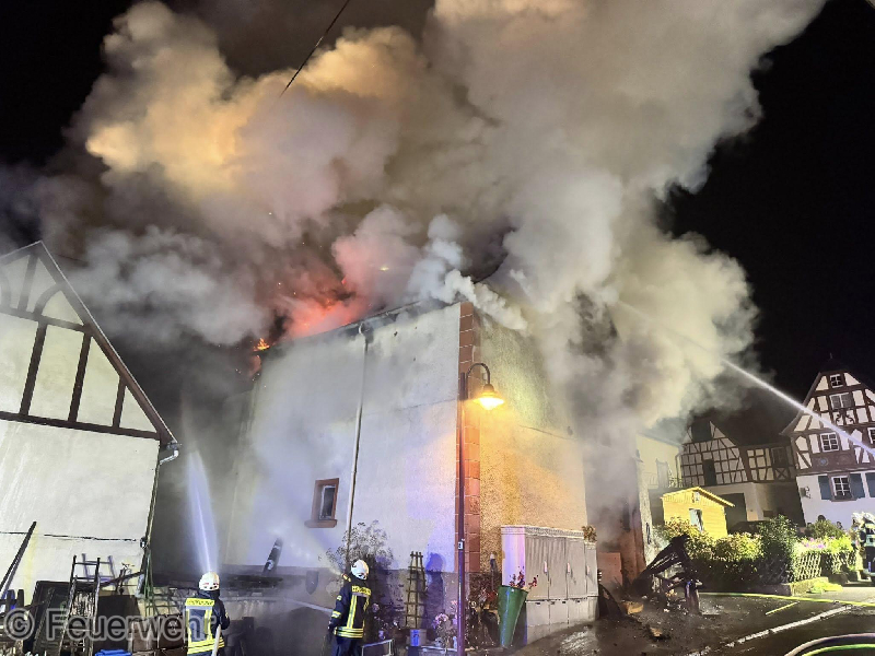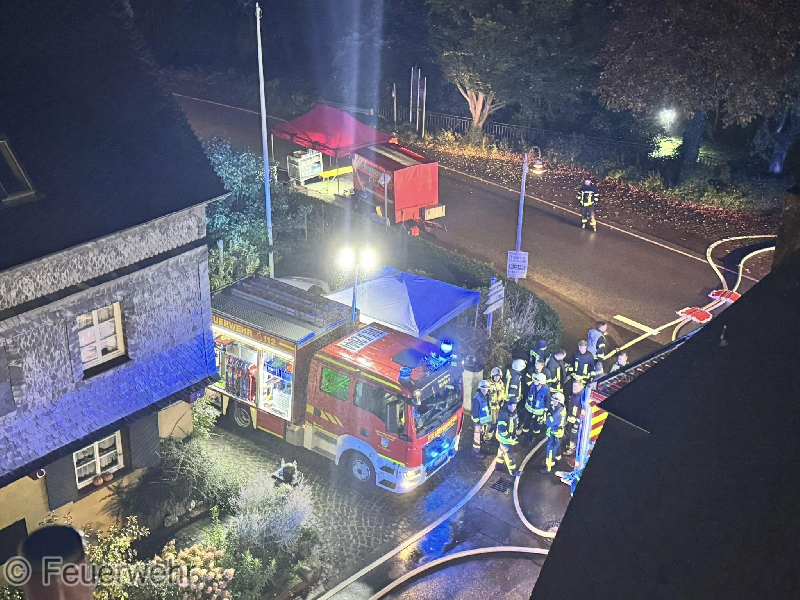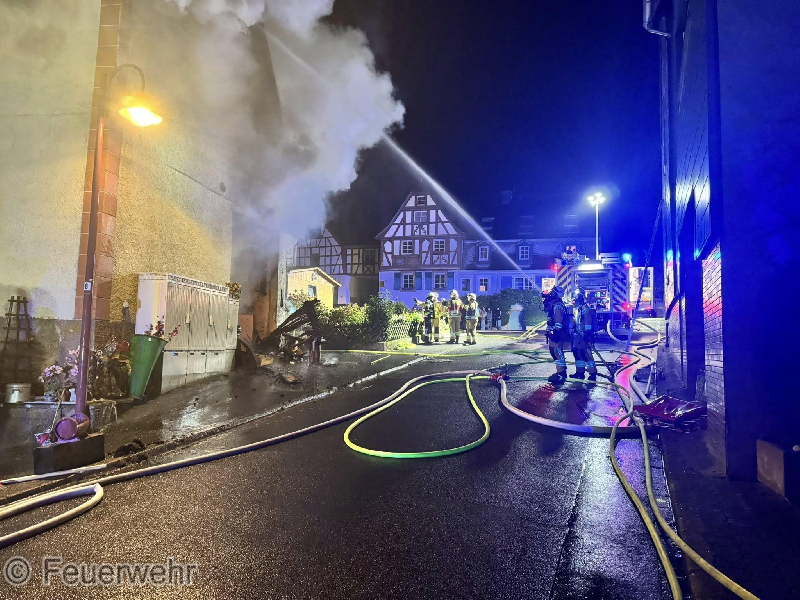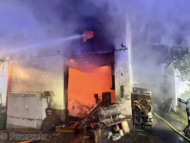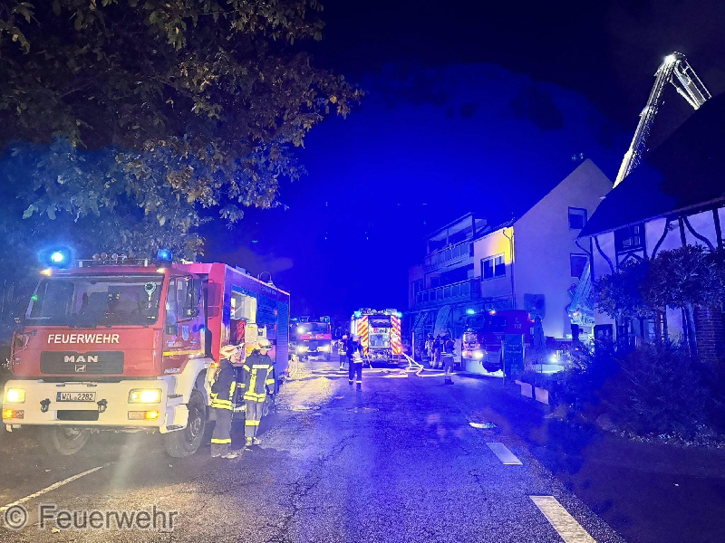 Zu einem gemeldeten Wohnungsbrand mit Menschenrettung wurden die Wehren in die Ortslage Kröv alarmiert. Vor Ort konnte eine Scheune vorgefunden werden, die sich bereits im Vollbrand befand und das sich das Feuer im Dachbereich auf zwei weitere Wohnhäuser übergriff. Während der Erkundung stellte sich glücklicherweise heraus, dass sich keine Personen mehr in den betroffenen Gebäuden befanden. Sofort wurde damit begonnen, von außen mit mehreren Strahlrohren einen Löschangriff durchzuführen. Hier kam auch eine zweite Drehleiter zum Einsatz. Gleichzeitig wurde in einem der Dachgeschosse eines Wohnhauses mit mehreren Atemschutztrupps der Innengriff durchgeführt. Um die Wasserversorgung sicherzustellen, mussten von der Mosel aus mehrere Schlauchleitungen zur Einsatzstelle verlegt werden. Im späteren Verlauf des Einsatzes wurde die Scheune mit Schaum geflutet, um die letzten Glutnester zu ersticken. Auf Grund des Brandes mussten mehrere in der Nähe befindliche Ferienwohnungen evakuiert werden. Hier wurden 21 Personen übergangsweise in der Weinbrunnenhalle untergebracht und durch Kräfte des Deutschen Roten Kreuz und des Malteser Hilfsdienstes betreut. Diese konnten später wieder in die Wohnungen zurück kehren. Bei dem Einsatz wurden zwei Personen mit Verdacht auf Rauchgasvergiftung an den Rettungsdienst übergeben. Für die Dauer des Einsatzes musste die B53 in der Ortslage voll gesperrt werden.