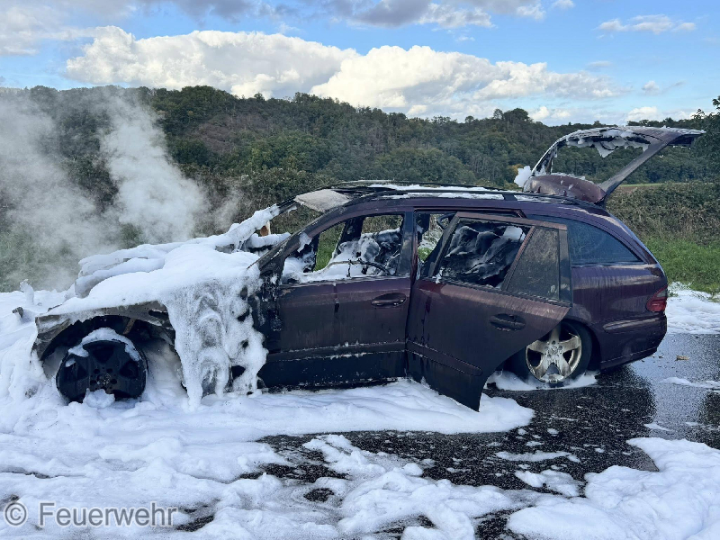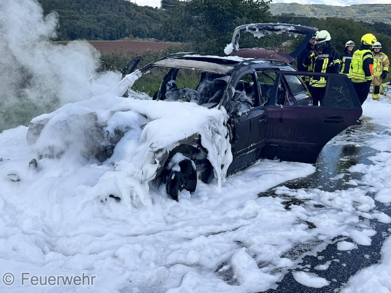 Auf der B421, Kinderbeuern Richtung Hontheim, kam es zu einem Fahrzeugbrand. Beim Eintreffen der ersten Kräfte stand ein PKW bereits im Vollbrand. Durch die Feuerwehr wurde sofort ein Löschangriff durchgeführt. Erschwert wurde dieser durch auslaufendes Benzin, das sich ebenfalls entzündete und brennend über die Straße lief. Zeitgleich mussten mehrere geladene Säcke von Holzpellets abgelöscht und aus dem Fahrzeug verbracht werden. Während des Einsatzes war die B421 komplett gesperrt.
