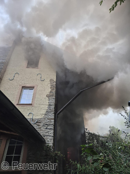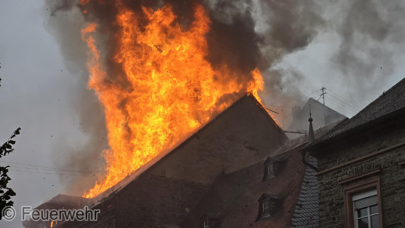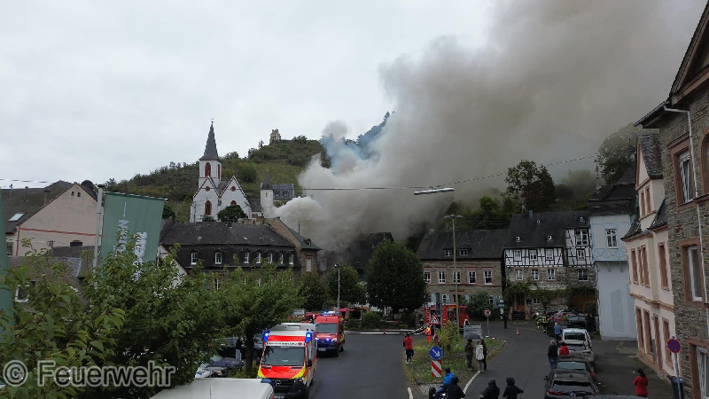 Im Laufe des Einsatzes geriet das Feuer außer Kontrolle und ging auf den Dachstuhl über. Hier wurden sofort alle Einsatzkräfte auf Grund akuter Einsturzgefahr des Dachstuhls aus dem Gebäude zurück gezogen. Sofort wurde die Brandbekämpfung von außen mit mehreren Strahlrohren und dem Teleskopgelenkmast eingeleitet. Auf Grund der Lage wurden abermals mehrere Wehren nachalarmiert. Unter anderem auch weitere Hubrettungsfahrzeuge um die Brandbekämpfung von außen zu unterstützen. Außerdem kam es durch die große Wasserabnahme an der Einsatzstelle zu Problemen mit dem Wassernetz, worauf hin der KatS-Zug des Landkreises alarmiert wurde um mehrere Wasserleitungen von der Mosel zur Einsatzstelle zu verlegen, um eine weitere Wasserversorgung sicherzustellen.