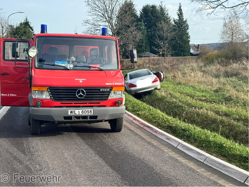 In Hontheim kam am Ortseingang ein PKW von der Fahrbahn ab und geriet in einen Graben. Da das Fahrzeug mit der Fahrertür im Graben auflag konnte sich die Fahrzeugführerin nicht selbstständig befreien. Vor dem Eintreffen der ersten Kräfte konnte die Person schon durch Ersthelfer aus dem Fahrzeug befreit werden. Durch die Feuerwehr wurde die Einsatzstelle während des Einsatzes abgesichert.